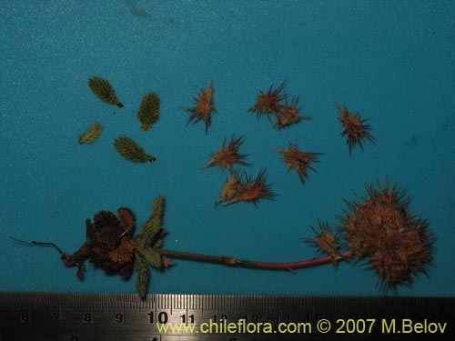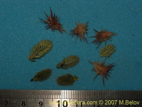 This plant is common at medium elevations in central Chile and is easy to grow. Of the acaenas, it is not very known, but I find it very much attractive due to its small, compact leaves which form a carpet, small, almost pigmy size which would fit almost anyplace, and the fruits do not have the thorns of the other, more aggressive acaenas. The plant requires poor, sandy soil with good drainage. It routinely withstands cold winters with snow, so hardiness is not a problem. The seeds are easy to germinate using the standard procedure of cold stratification. Please note that we sell "fruits" from which we do not extract the seeds.